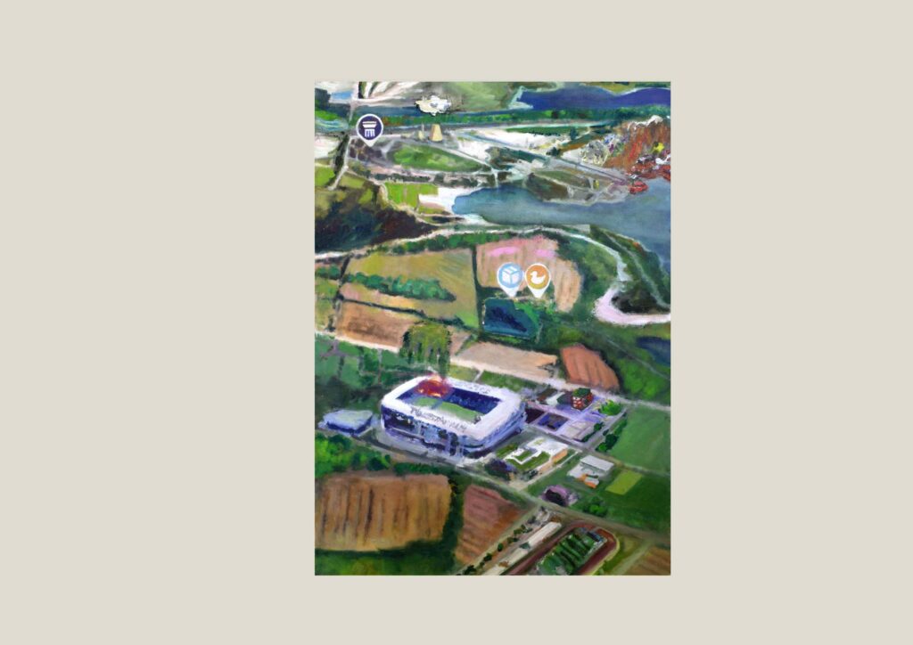 This results in playful world maps that resemble satellite photos of the Earth viewed from space. These paintings feature symbols, most of which are inventions of the artist’s own, emerging from his paintings of figures and objects and located on the map. A stadium can also always be seen there. So you could use the internet to get a free glimpse inside.